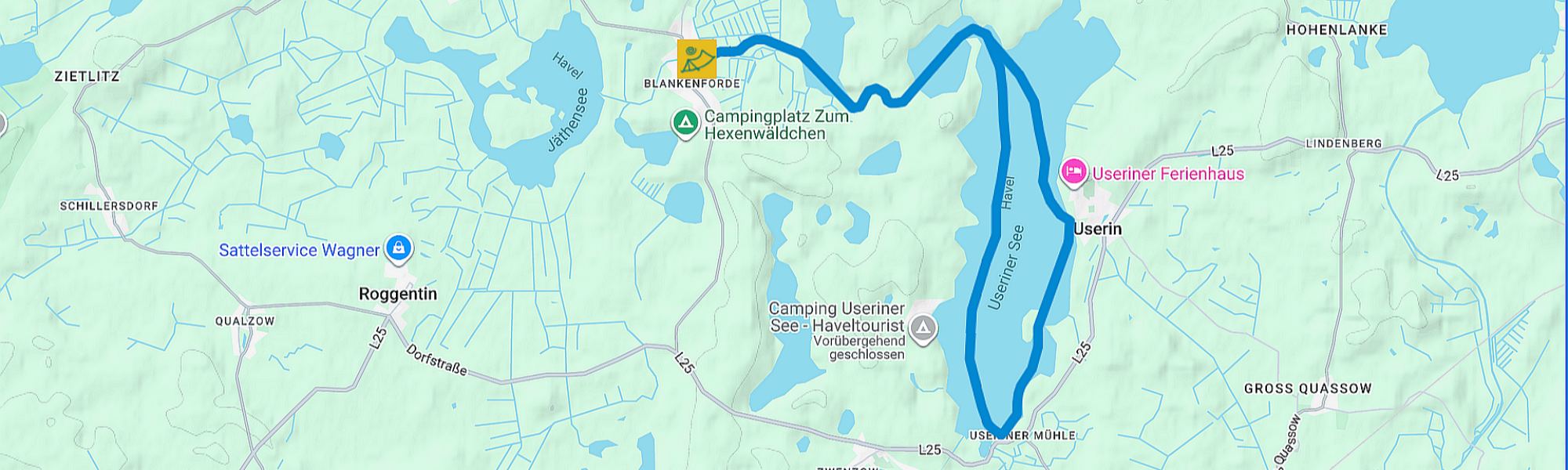 Die anspruchsvolle Kanutour von Blankenförde zur Useriner Mühle ist eine abwechslungsreiche Tagestour mitten durch den Müritz-Nationalpark. Sie führt über die Havel, den Käbelicksee und den motorbootfreien Useriner See. Besonders bei Wind kann der Useriner See etwas herausfordernder sein und erfordert eine gute Kondition. Eine attraktive Pausenmöglichkeit bietet das italienische Restaurant Al Lago mit schöner Seeterrasse und Bademöglichkeit. Wer noch Lust und Kraft hat, kann noch einen Abstecher zur Badestelle von Userin machen. Oder nimmt diese gleich als Ziel.