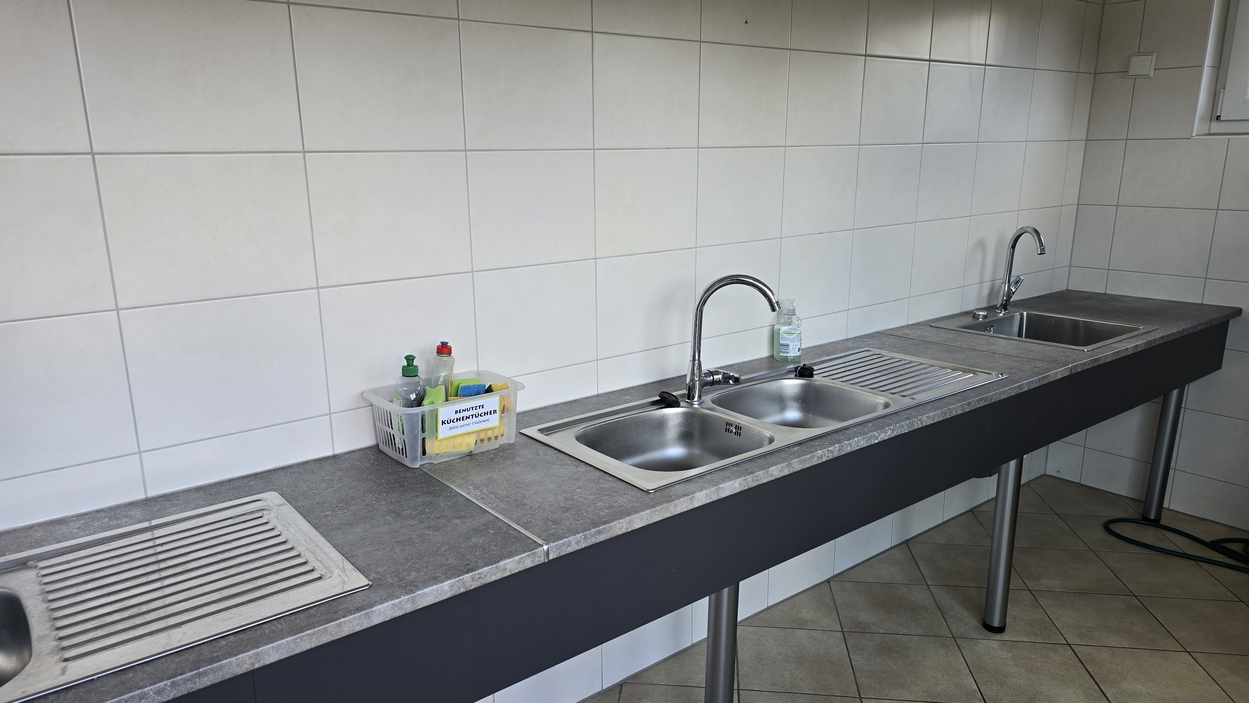-      Neues Sanitär Gebäude mit Waschräumen, WCs und Duschen, Spülbereich (mit großen Kühlschrank, Wasserkocher und Steckdosen)