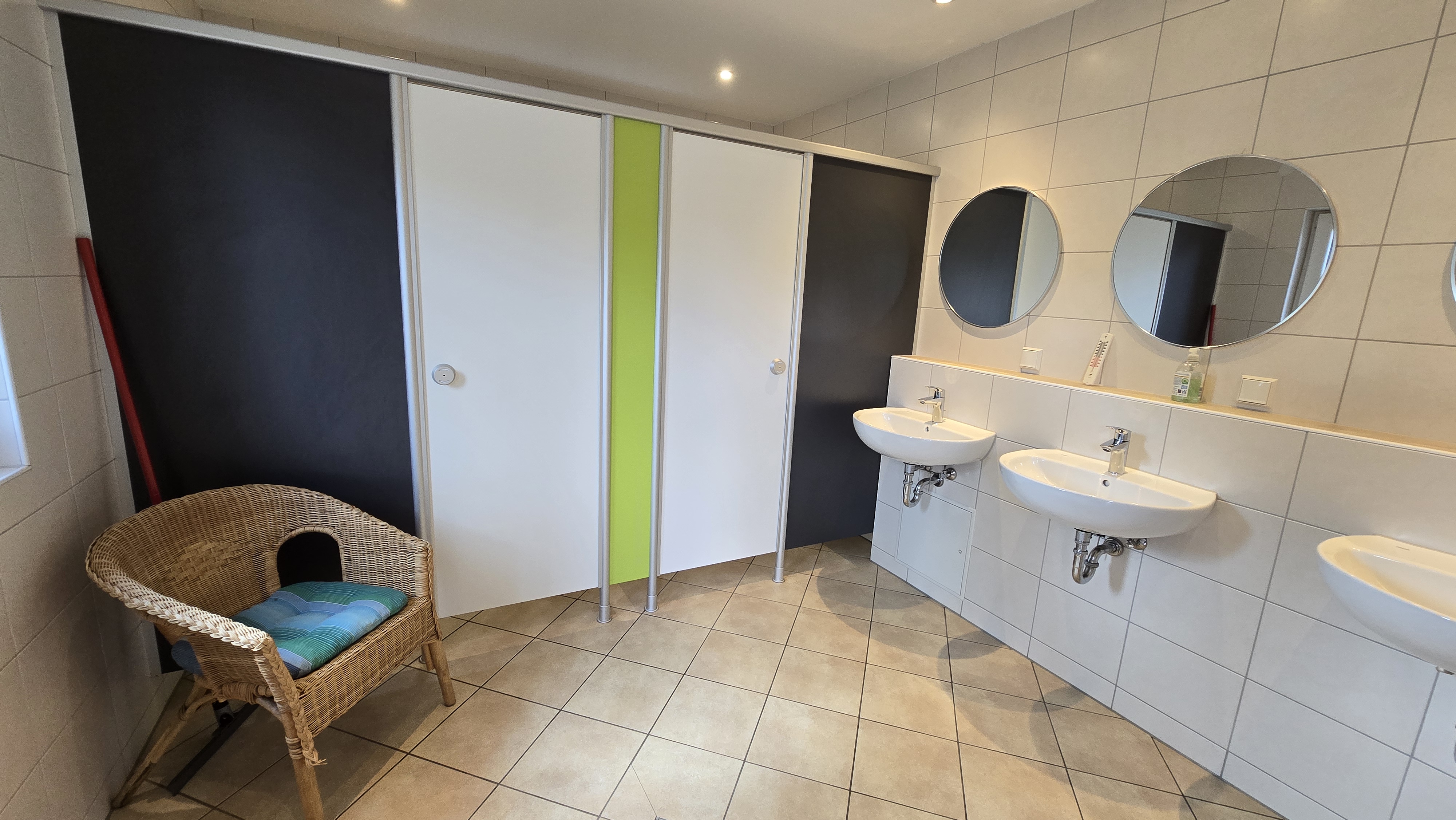 Unser nagelneues Sanitärgebäude befindet sich in der Mitte der Zeltwiese. Dort befinden sich je 4 Toiletten, Spülbereich, Wasch- und Duschraum (mit je 2 Duschen). Das ganze Gelände ist mit einem Wildzaun eingezäunt und für die Öffentlichkeit nicht zugänglich.